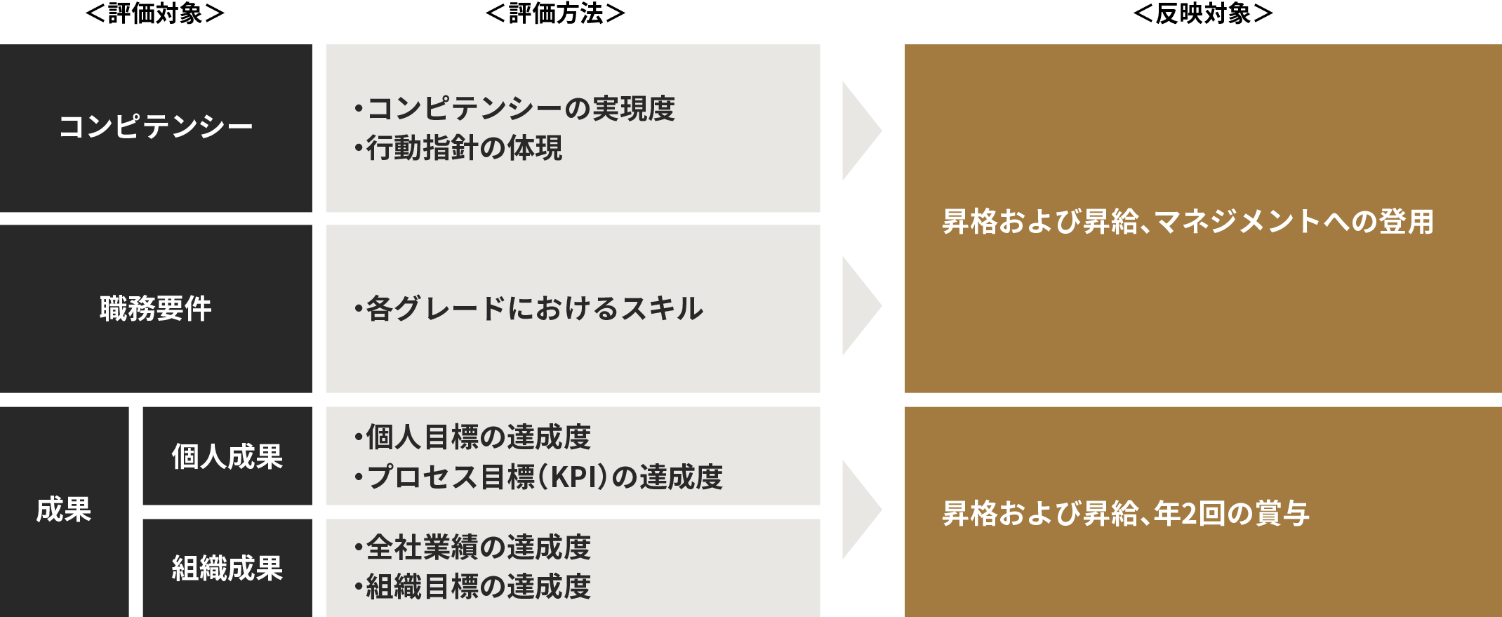 一人ひとりが発揮する実力を公平に評価し、正当に還元するために、課題解決力・対人折衝力・組織成長力といった必要な能力(コンピテンシー)を定めています。そして、半期ごとに目標を設定し、その成果や日々の行動を含む3つの切り口で基準を明確化。適切な評価を行い、グレードや賞与へと反映しています。